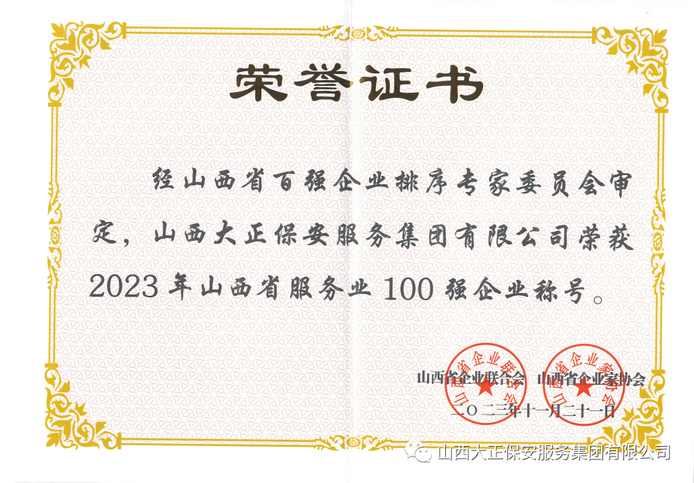 山西大正保安服務(wù)集團有限公司作為市屬唯一一家國有安保企業(yè),22年來緊緊圍繞強企興企第一要務(wù),把握時代發(fā)展機遇,積極貫徹新發(fā)展理念,主動擔(dān)當(dāng)作為、認(rèn)真履職盡責(zé),不斷提升服務(wù)水平,努力推動建設(shè)國內(nèi)一流綜合型保安服務(wù)集團的步伐,在國企黨建、內(nèi)部管理、經(jīng)營業(yè)績、企業(yè)文化、安全生產(chǎn)、履行社會責(zé)任等方面不斷規(guī)范推進,連續(xù)9年榮獲“山西省服務(wù)業(yè)企業(yè)100強”,展現(xiàn)出山西大正保安集團由小變大、由弱變強的奮進歷程,創(chuàng)造了山西大正保安集團全方位高質(zhì)量發(fā)展的新偉業(yè)。