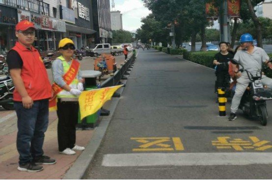 紅燈亮起,停車線邊的工作人員便舉起手中的小旗,向行人與車輛作出停止示意,并對停車位置有誤的電動車做出指揮和引導(dǎo),對搶行、闖紅燈等不遵守交規(guī)的行人進(jìn)行制止;對年紀(jì)較大、腿腳不便的居民,志愿者主動攙扶,護(hù)送其安全的過馬路。在志愿者的文明勸導(dǎo)下,行人闖紅燈現(xiàn)象明顯減少,車輛和行人安全有序通行,道路交通安全暢通。