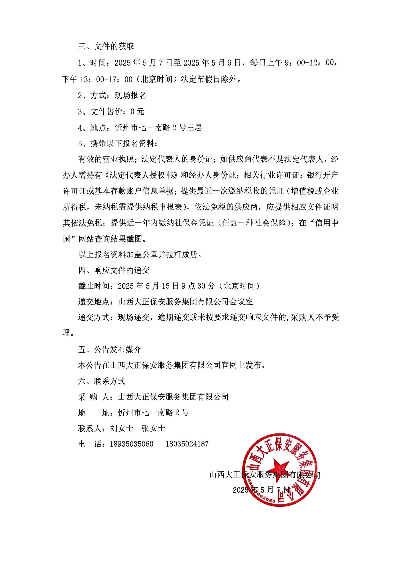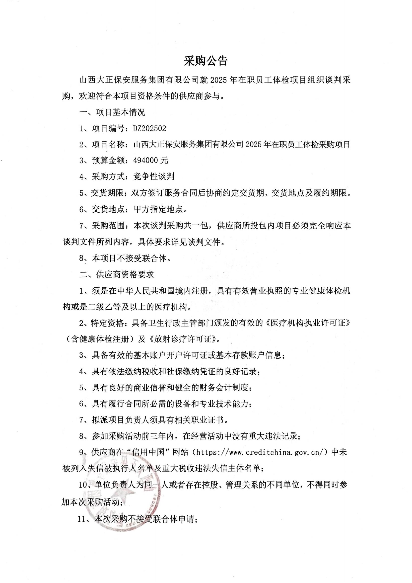 山西大正保安服務(wù)集團(tuán)有限公司2025年在職員工體檢采購項(xiàng)目廢止的