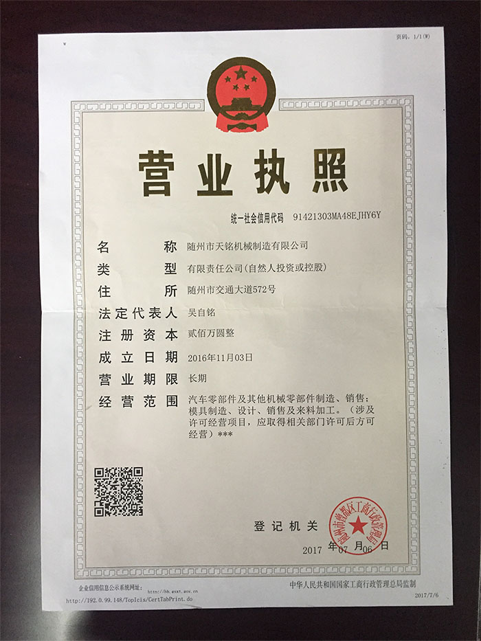 隨州市天銘機(jī)械制造有限公司地處中國專用汽車之都、炎帝神農(nóng)故里、編鐘古樂之鄉(xiāng)、歷史文化名城圣地車都—---隨州,是2015創(chuàng)立的新興企業(yè);主要生產(chǎn)汽摩配、機(jī)械設(shè)備系列鋁合金零部件的專業(yè)化公司,具有年產(chǎn)各類零部件10萬臺套的生產(chǎn)能力;公司致力于發(fā)展智能化,自動(dòng)化汽車配套產(chǎn)品。目前已有智能高壓灑水炮產(chǎn)品,并獲得兩項(xiàng)國家專利(實(shí)用新型專利 專利號:ZL 2016 2 0962285.1 外觀設(shè)計(jì)專利 專利號:ZL 2016 3 0428566.4 )。公司著重以減輕人力操作強(qiáng)度為發(fā)展方向,升級產(chǎn)品,升級工藝。向技術(shù)要效益,向工藝要產(chǎn)值,向品質(zhì)要客戶!努力實(shí)現(xiàn)上中下游共贏!