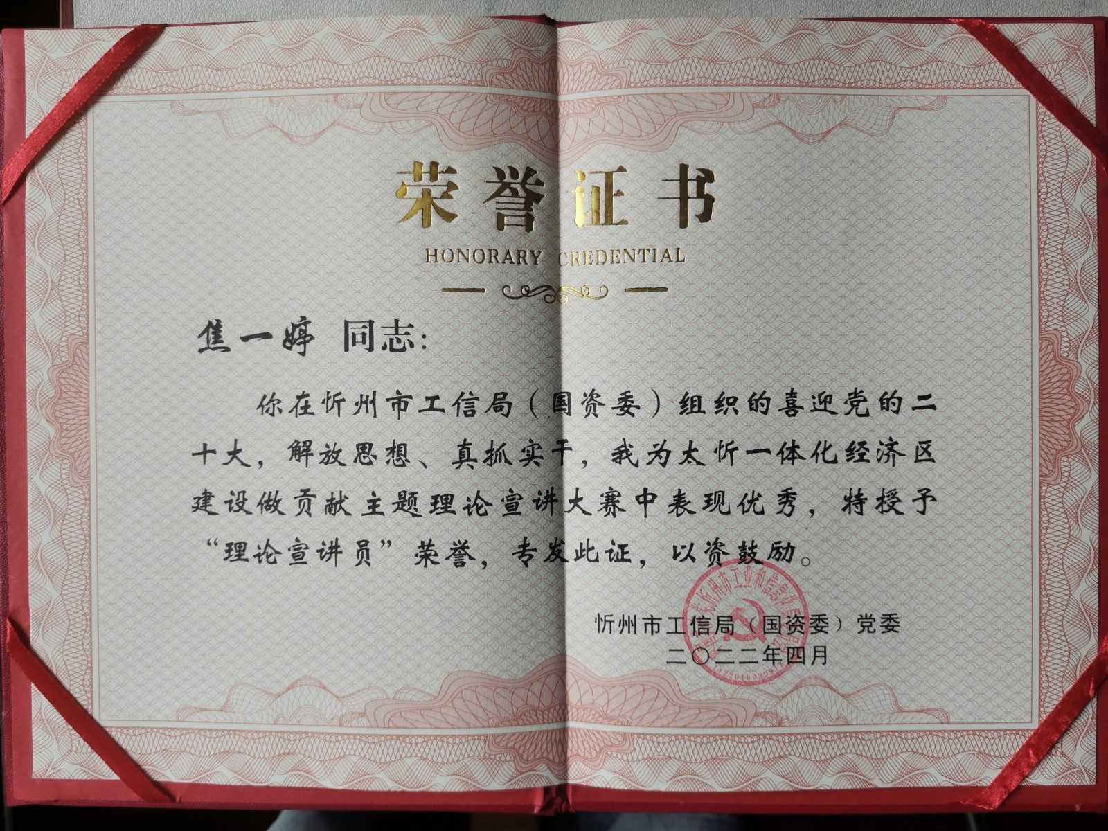 3月21日,以喜迎黨的二十大,解放思想、真抓實(shí)干,我為太忻一體化經(jīng)濟(jì)區(qū)建設(shè)做貢獻(xiàn)為主題的“忻州市第二屆理論宣講大賽”中,我公司參賽人員焦一婷緊扣演講主題,以“忻州市創(chuàng)建文明城市”為抓手,充分結(jié)合自己在創(chuàng)建文明城市中的所做、所見、所聞,就作為一名國企員工如何在工作中解放思想,真抓實(shí)干展開演講,用實(shí)實(shí)在在發(fā)生在身邊的志愿實(shí)例說明問題,通俗易懂,極富感染力。大賽組委會結(jié)合當(dāng)前省內(nèi)疫情防控實(shí)際,開展線下比賽組織參賽選手以錄制視頻的形式參賽,最終經(jīng)過忻州市工信局(國資委)黨委的評比,參賽人員焦一婷榮獲“理論宣講員”稱號,并獲得獎(jiǎng)品《人世間》、《創(chuàng)業(yè)史》書籍兩套。