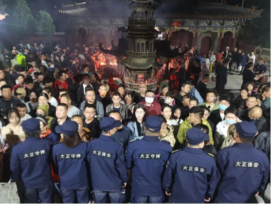 凌晨0點過后,車流量、人流量逐步增多,還愿、許愿香客絡繹不絕,執(zhí)勤隊員一邊要維持秩序,一邊還要檢查是否攜帶香火蠟燭燈等易燃物品進入寺廟。凌晨0時直到次日中午12時在長達 24個小時的時間里,公司帶隊領導和隊員們始終堅守在一線,充分體現(xiàn)了大正保安人紀律嚴明、吃苦耐勞、能打硬仗、團結(jié)一致的優(yōu)良作風。執(zhí)勤中,全體保安隊員堅守崗位、履職盡責、文明執(zhí)勤,維持秩序、服務群眾,營造了安全祥和的氣氛,圓滿完成了此次廟會安;顒,展示了國企保安專業(yè)水準和良好的精神風貌。