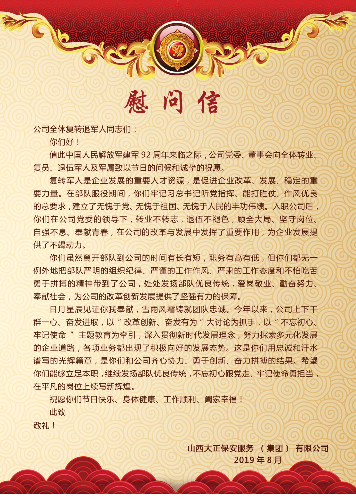 2019年7月31日上午,公司在四樓會議室隆重組織召開了“八一”慰問退役軍人、軍屬座談會,大家歡聚一堂,同慶建軍佳節(jié)、共敘魚水情深、暢談企業(yè)發(fā)展。黨委副書記、副總經(jīng)理陳志平主持會議,趙培宏、王明生、邢春生等公司領(lǐng)導(dǎo)及退役軍人代表、軍屬代表百余人參加了座談會。