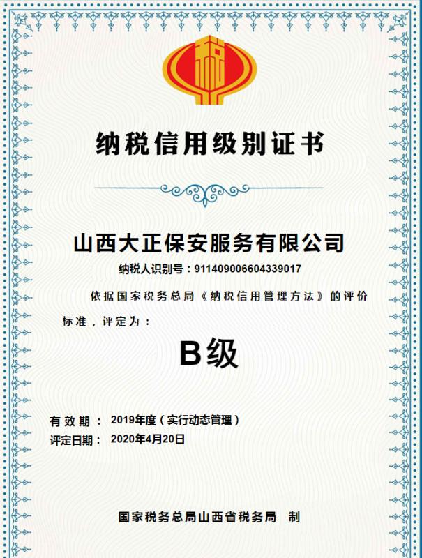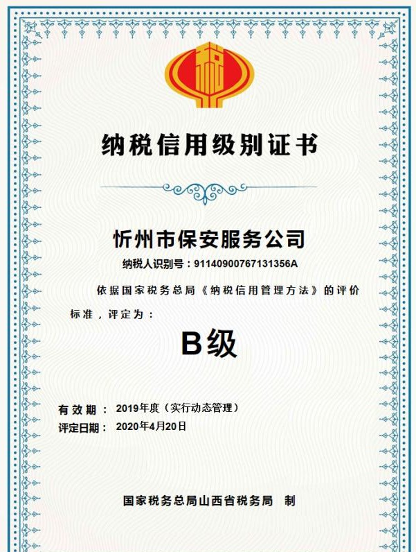 近日,山西大正保安服務(wù)有限公司和忻州市保安服務(wù)公司在國家稅務(wù)局忻州市經(jīng)濟(jì)技術(shù)開發(fā)區(qū)分局的2019年度納稅信用級(jí)別評(píng)定工作中分別獲得納稅信用等級(jí)“B級(jí)”評(píng)定。