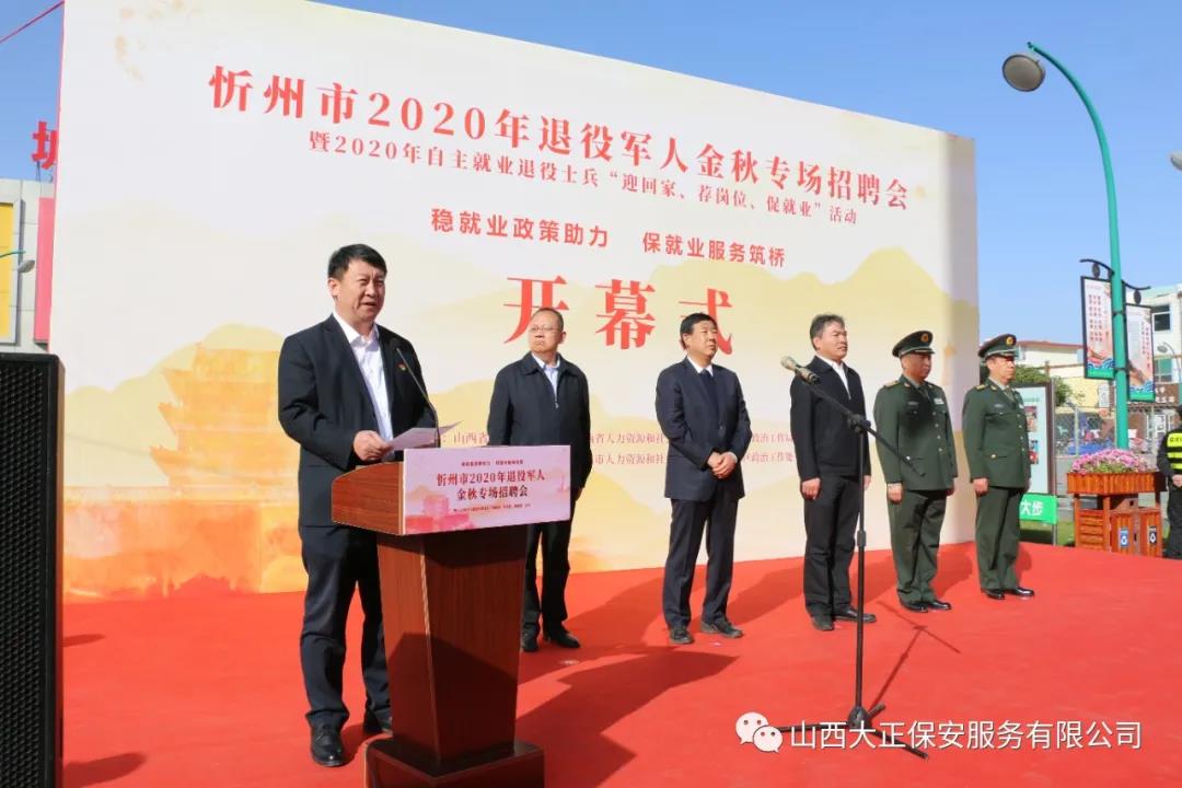 10月21日,由山西省退役軍人事務廳、山西省人力資源和社會保障廳、山西省軍區(qū)政治工作局主辦,忻州市退役軍人事務局、忻州市人力資源和社會保障局、山西省忻州軍分區(qū)承辦的忻州市2020年退役軍人金秋專場招聘會于忻州體育廣場舉行,活動以“穩(wěn)就業(yè)政策助力,保就業(yè)服務筑橋”為主題。山西大正保安服務集團有限公司總經理趙培宏作為參會企業(yè)代表上臺發(fā)言,集團公司人力資源中心工作人員在現(xiàn)場開展招聘活動。