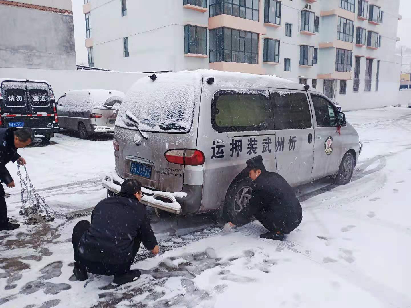 由于降雪天氣給運鈔車安全行駛導致安全隱患,中隊每日關(guān)注天氣情況有效應(yīng)對,及時安排各車組提前做好出車前車輛安全檢查以及安裝防滑鏈,同時囑咐要注意車速,確保行車安全。安全無小事,每一次往返任務(wù)都牽動著公司領(lǐng)導的心。由于天氣惡劣,車隊出發(fā)后,中隊管理人員一步不離堅守在崗位上,和各車組隨時保持著聯(lián)系,有時隊長、副隊長親自跟車,以便及時了解各車組途中的實際情況。
