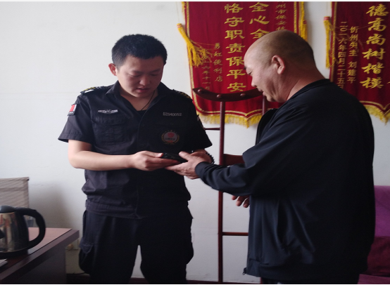 5月9日,山西大正億通保安安全技術(shù)公司巡邏隊(duì)隊(duì)員楊鑫磊、姜濤在開展日常巡邏工作中,在某銀行發(fā)現(xiàn)一個(gè)黑色駕駛證本,里面裝有現(xiàn)金、證件及銀行卡。