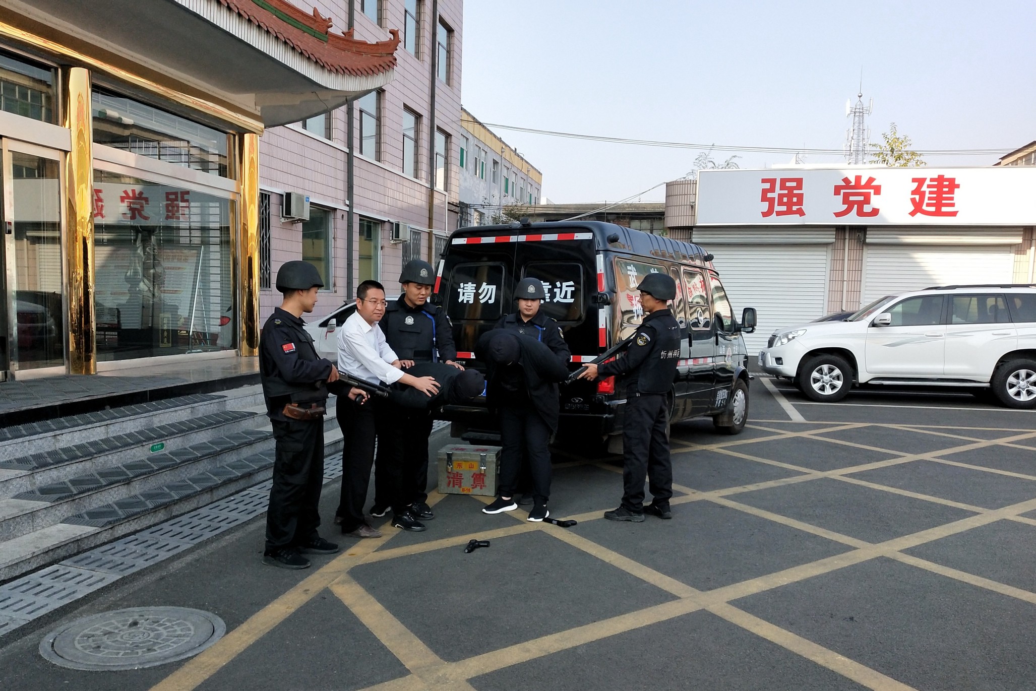 為切實(shí)提高押運(yùn)隊(duì)員安全防范意識,使押運(yùn)隊(duì)員進(jìn)一步熟悉和掌握防暴力搶劫應(yīng)急預(yù)案流程,增強(qiáng)應(yīng)對突發(fā)事件的處置能力和實(shí)戰(zhàn)能力,我中隊(duì)于2019年9月29日上午9時(shí)在繁峙農(nóng)村商業(yè)銀行院內(nèi)實(shí)施運(yùn)鈔車突遇犯罪份子持仿真手槍搶劫款箱應(yīng)急處置預(yù)案聯(lián)合演練。