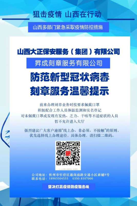山西大正昇成刻章服務(wù)有限公司將繼續(xù)響應(yīng)集團(tuán)公司號(hào)召,在疫情期間嚴(yán)格落實(shí)各項(xiàng)規(guī)章制度,并通過(guò)線(xiàn)下線(xiàn)上齊發(fā)力的方式迎來(lái)業(yè)務(wù)加速拓展。